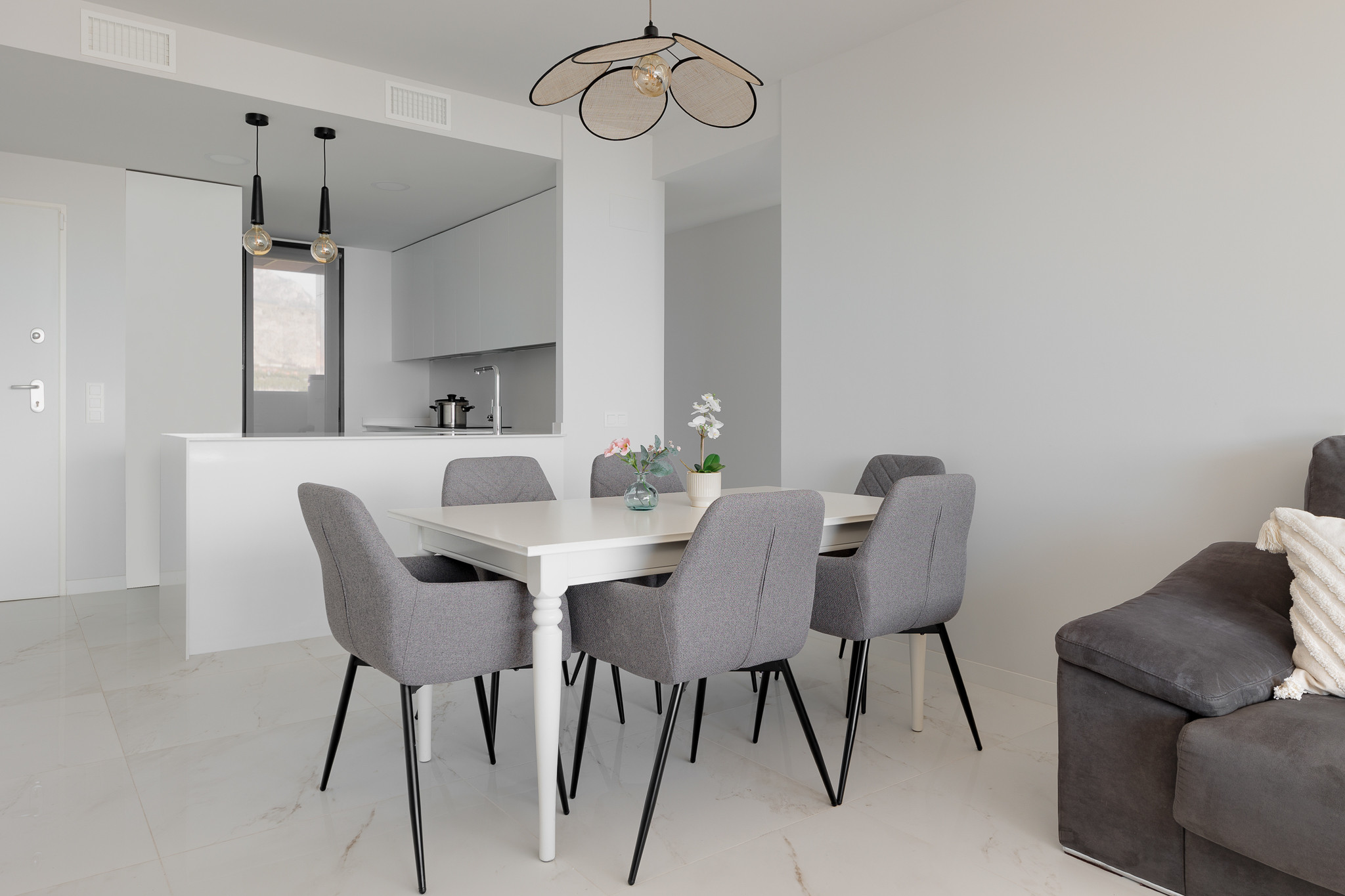 The apartment in Benidorm has 3 bedrooms and has capacity for 6 people (max. 4 adults). The apartment is tastefully-furnished, is a new build, and is 105 m². The property is located right next to the beach. It has views of waterfront and the mountain. The property is located 0 m from the international airport, 20 m from Varios park, 50 m from La Falua the restaurant, 50 m from Guiomar coffee shop, 100 m from Mercadona supermarket, 150 m from Playa de Poniente sand beach, 1 km from Villaitana, Finestrat y Benidorm golf course, 1 km from TRAM Alicante train station, 1 km from Sierra Cortina nature reserve, 2 km from Terra Mitica amusement park / theme park, 2 km from Aqualandia water park, 2 km from Estacion de buses Benidorm bus station, 2 km from Casco antiguo de Benidorm city, 3 km from Hospital Publico de Villajoyosa hospital, 45 km from Alicante Airport airport. The house is situated in a family-friendly neighborhood next to the sea.The accommodation is equipped with the following items: lift, garden, garden furniture, fenced garden, 24 m² terrace, washing machine, iron, internet (Wi-Fi), hair dryer, childrens area, paddle tennis court, gym / fitness centre, sauna, hot tub, spa, heat pump, air conditioning throughout the house, communal+children's swimming pool, communal heated swimming pool, garage the same building, 1 TV, satellite tv (Languages: Spanish, English), radio.In the induction open plan kitchen, refrigerator, microwave, oven, freezer, dishwasher, dishes/cutlery, kitchen utensils, coffee machine, toaster, kettle and juicer are provided.