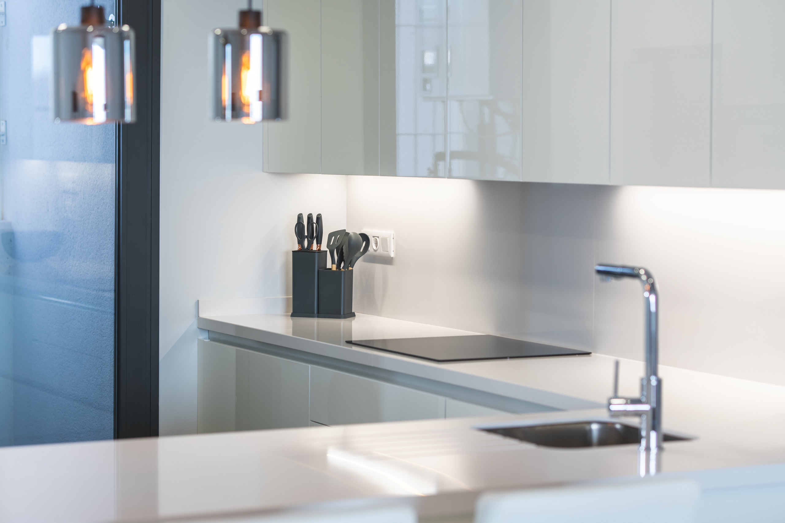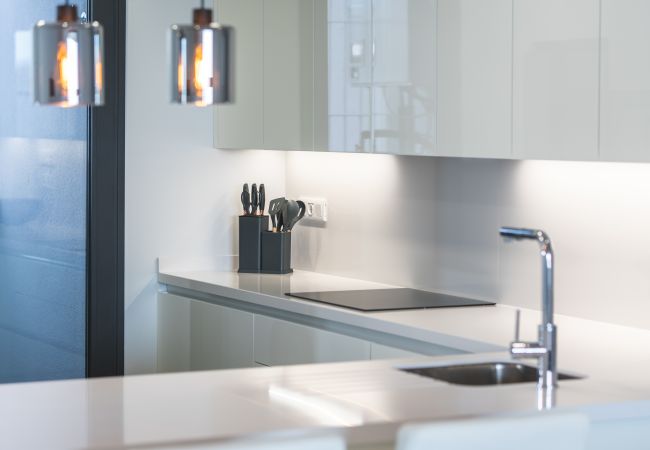 La cuisine américaine, à induction, est équipée avec réfrigérateur, micro-ondes, four, congélateur, lave-vaisselle, vaisselle/couverts, ustensiles/cuisine, cafetière, grille pain, bouilloire et presse-agrumes.