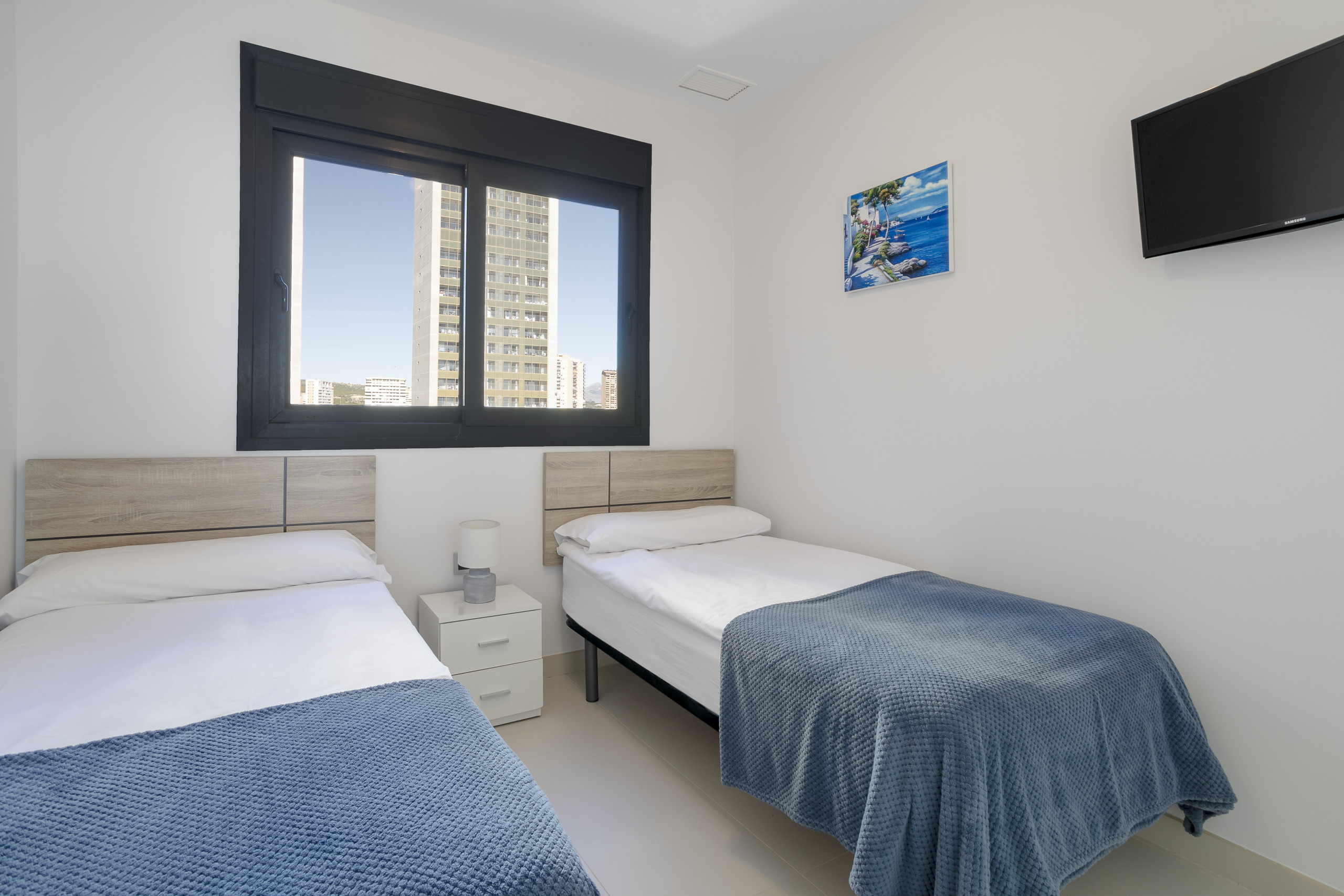 Sypialnia główna wyposażona jest w łóżko podwójne (1,50 m x 2 m), telewizor, garderobę oraz designerską łazienkę z prysznicem. Z tego pokoju można wyjść na duży taras apartamentu (25 m²), z którego roztacza się panoramiczny widok na plażę i wyspę Benidorm.