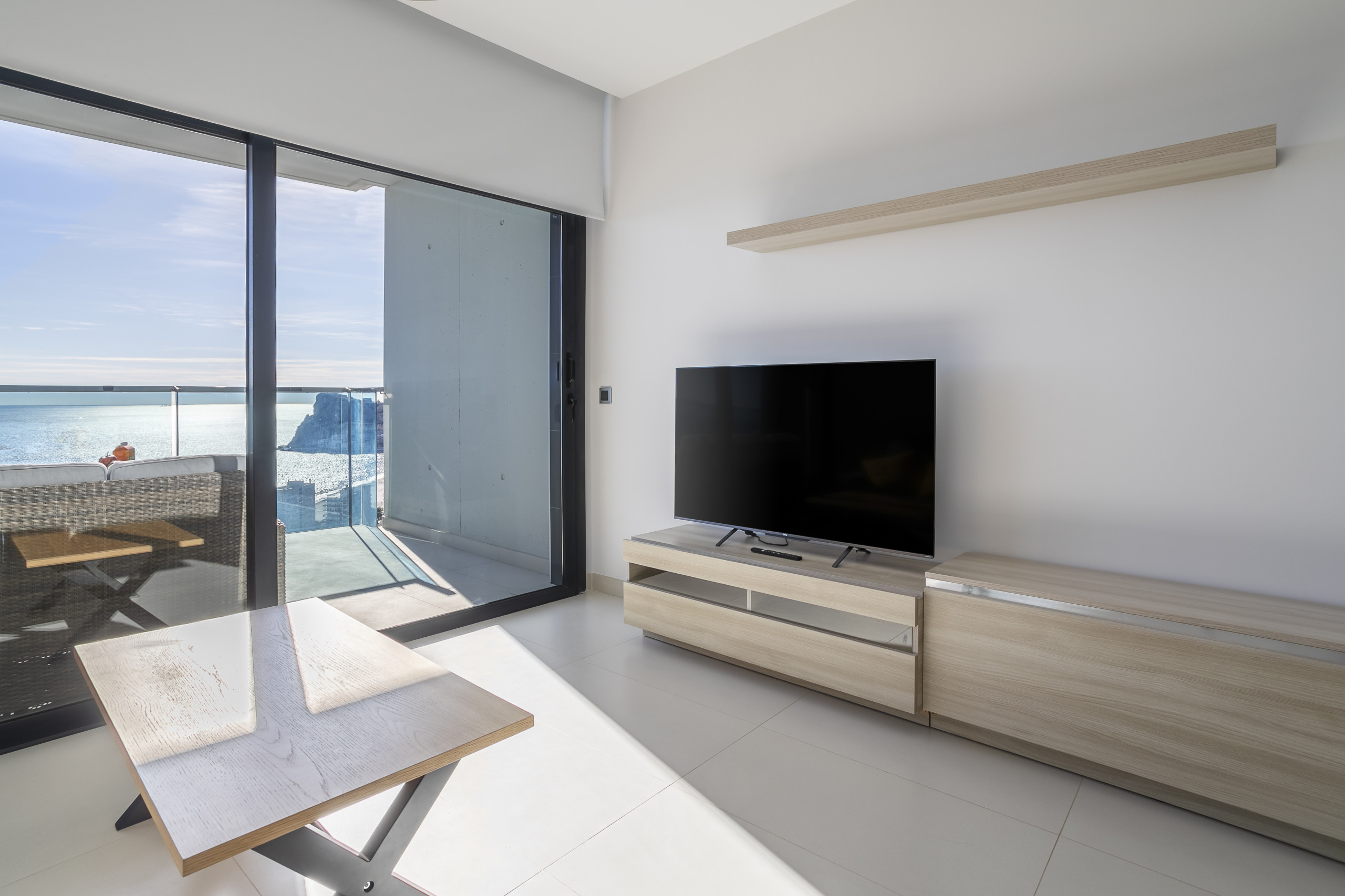 Apartament znajduje się w nowoczesnym budynku z dwiema windami – na każdej klatce schodowej przypadają tylko dwa apartamenty – i wyróżnia się designerskim wnętrzem, udogodnieniami oraz dużym tarasem z widokiem. Klimatyzowany salon z jadalnią zachęca do spotkań z rodziną i spędzania przyjemnych wieczorów. Sofa (1,40 m x 2 m) może zostać rozłożona i stać się sofą rozkładaną dla dwóch osób, dzięki czemu apartament pomieści do 6 osób.