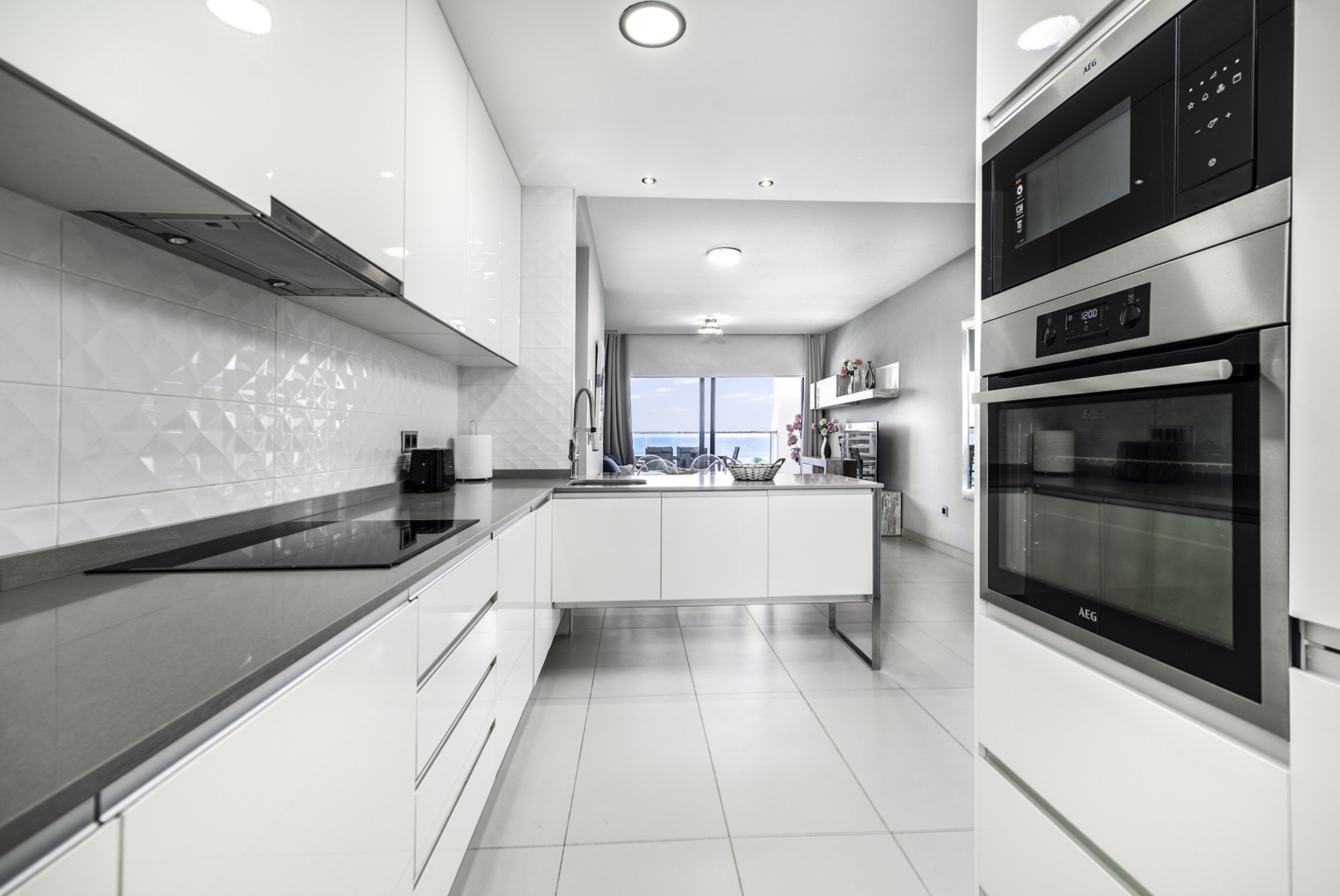 Are you a coffee fan? You’re in luck! There is a Miele coffee machine. When you have finished cooking and eating, your fully fitted Siemens dishwasher will clean all of your crockery and cutlery back to perfection. The huge fridge/freezer is large enough to hold all the things you bring back from the supermarket, no matter how long your shopping list is. But the best thing about your kitchen is that whether you are cooking, mixing drinks or anything else, you will always have a fantastic view of the sea, stretching all the way to the horizon.